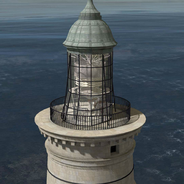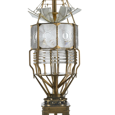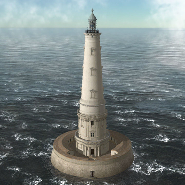 En juillet 1823, Fresnel installe le premier appareil à lentilles à échelons au phare de Cordouan. Il lui a fallu trois ans presque jour pour jour pour passer du stade de l’idée à la réalisation finale. L’optique qu’il établit ce jour là est composée d’un tambour octogonal central muni de huit lentilles à échelons de 0,90 cm de focale. Au bas de l’ensemble, il installe des couronnes de miroirs métalliques chargées de renvoyer les rayons extrêmes vers la mer. Au sommet, il place huit petites lentilles à échelons qui reprennent les rayons supérieurs pour les renvoyer sur des miroirs dirigés vers l’horizon. L’apparence en mer de cette première optique de Cordouan est donc celle d’un point lumineux permanent augmenté toutes les minutes d’un éclat plus brillant qui dure quelques secondes puis s’estompe. L’optique en verre est maintenue par une armature métallique disposée autour d’un axe de rotation. Une horloge à poids défilant munie d’un échappement à boule régule la rotation du feu. Le gardien est ainsi obligé de remonter l’appareil chaque jour. Au centre de l’optique, on trouve une autre innovation importante : une lampe de phare munie de 5 mèches. En effet, pour augmenter la puissance du signal, il convient aussi d'accroître la force de la lampe. Fresnel utilise alors le principe des mèches cylindriques d’Argand qu’il améliore en les emmanchant les unes dans les autres (de 2 à 5). Enfin, pour empêcher que la chaleur ne détruise les soudures, il pompe de l’huile végétale en excès à l’aide d’un petit mécanisme d’horlogerie inventé par Bertrand Guillaume Carcel en 1800.