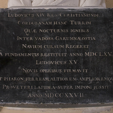 Dans la chapelle, au-dessus de la porte d'entrée, en face de l'autel, on distingue un buste entouré de deux inscriptions, l'une en français, l'autre en latin. Le buste est celui de Louis de Foix, l'ingénieur du phare, qui proclame la gloire de son œuvre. L'inscription latine a été mise en place en 1727 et chante les louanges de Louis XV pour les restaurations du phare qu'il a ordonnées. À la même place, sous le buste, figurait auparavant un poème, aujourd'hui disparu, louant le phare de Cordouan.